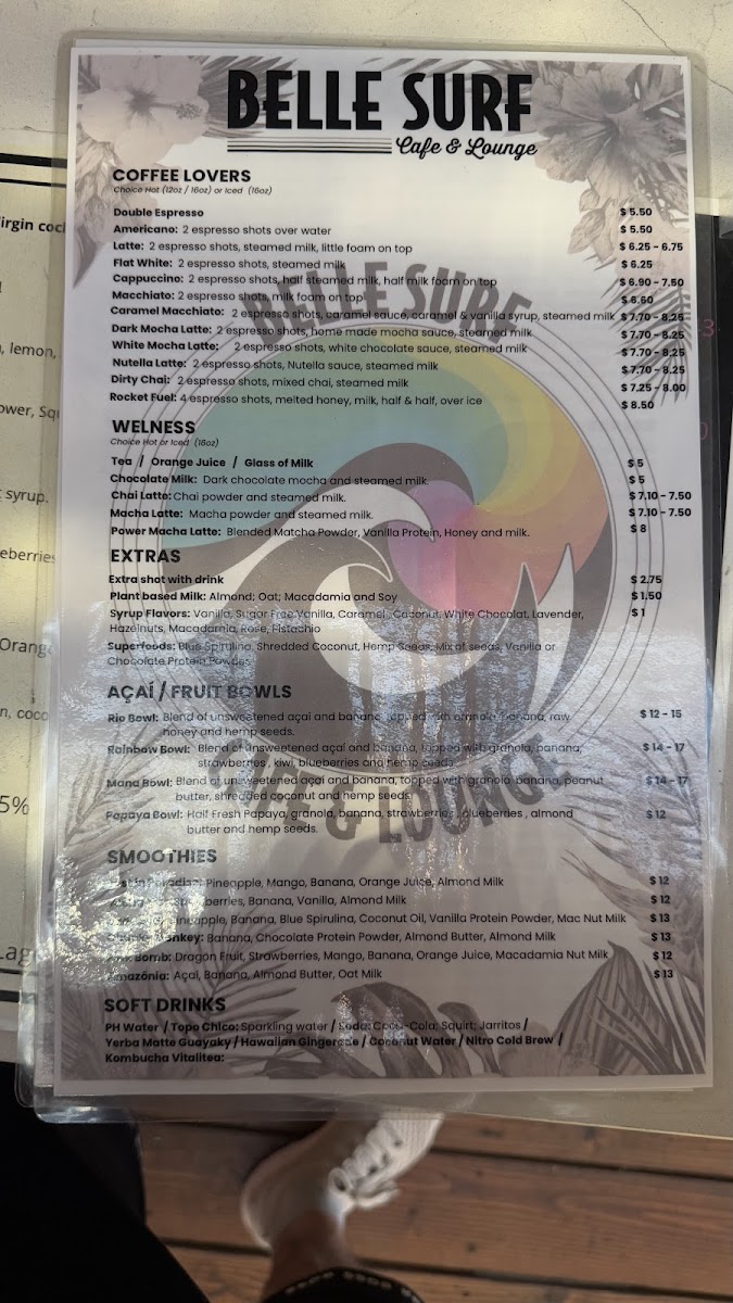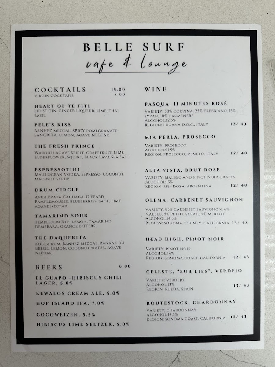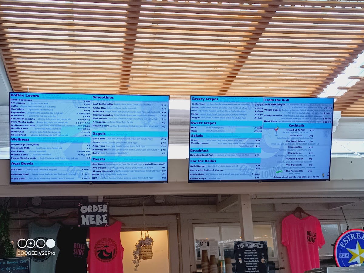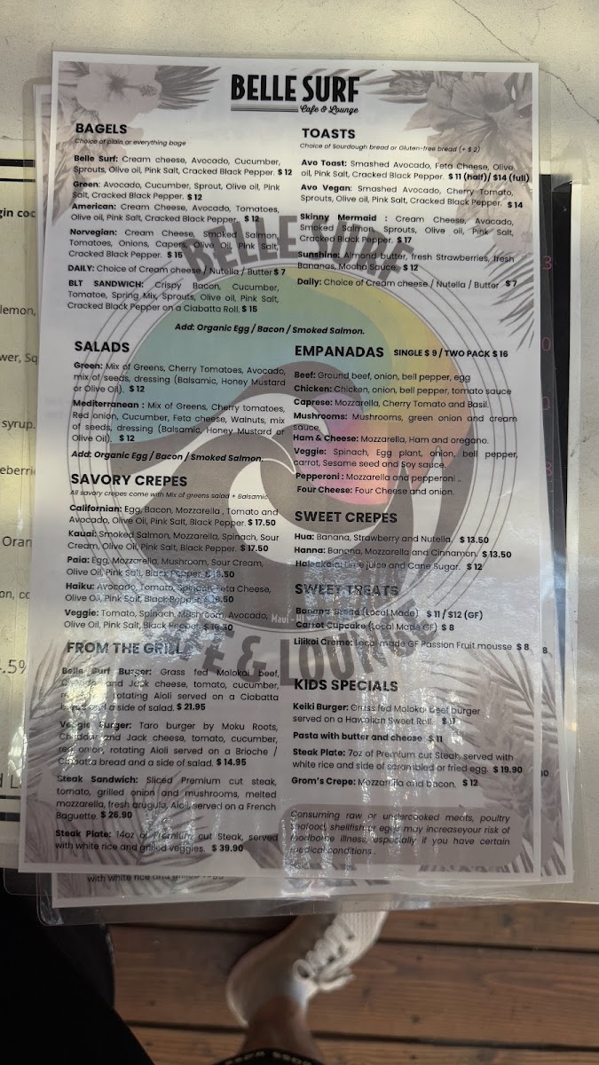 As a reviewer looking back on the menu at Belle Surf Cafe & Lounge, it’s clear that this spot thoughtfully blends casual island dining with wellness-driven choices, creating a menu that feels both relaxed and intentional. From the grill, classics like the Belle Surf Burger, Veggie Burger, Steak Sandwich, and Steak Plate deliver hearty satisfaction, while lighter options such as the Green Salad and Mediterranean Salad balance things out nicely. The café’s beverage selection is just as diverse, ranging from refreshing soft drinks like Ph Water, Topo Chico, Soda, Yerba Matte Guayaky, and Hawaiian Gingerade, to a coffee program that caters to true enthusiasts with options such as Double Espresso, Americano, Latte, Flat White, Cappuccino, Espresso, Macchiato, and Cold Brew, alongside specialty favorites like Caramel Macchiato, Dark Mocha Latte, White Mocha Latte, Nutella Latte, and Dirty Chai. Wellness-focused drinks including the Chai Latte, Matcha Latte, and Power Matcha Latte complement vibrant smoothies like Lost In Paradise, Aloha Kiss, Jade Sea, Chunky Monkey, and Pink Bomb. Food offerings continue to impress with Acai Fruit Bowls such as the Rainbow Bowl and Papaya Bowl, savory crepes like Californian, Kauai, and Paia Veggie, and sweet crepes including Hana, Hua, and Haleakala. Add in comforting bagels (Green, Norwegian, American, Daily Bagel), flavorful toasts like Skinny Mermaid, Sunshine, and Daily Toast, and indulgent desserts such as the Carrot Cupcake and Lilikoi Creme, and the menu feels complete. Even families are well considered with Kids Specials like the Keiki Burger, Pasta With Butter And Cheese, Steak Plate, and Grom's Crepe, plus customizable extras including Extra Shot With Drink, Plant Based Milk, and Superfoods. Altogether, the menu at Belle Surf Cafe & Lounge successfully ties together comfort food, island freshness, and mindful choices, making it a fitting reflection of its laid-back yet health-conscious Paia vibe.