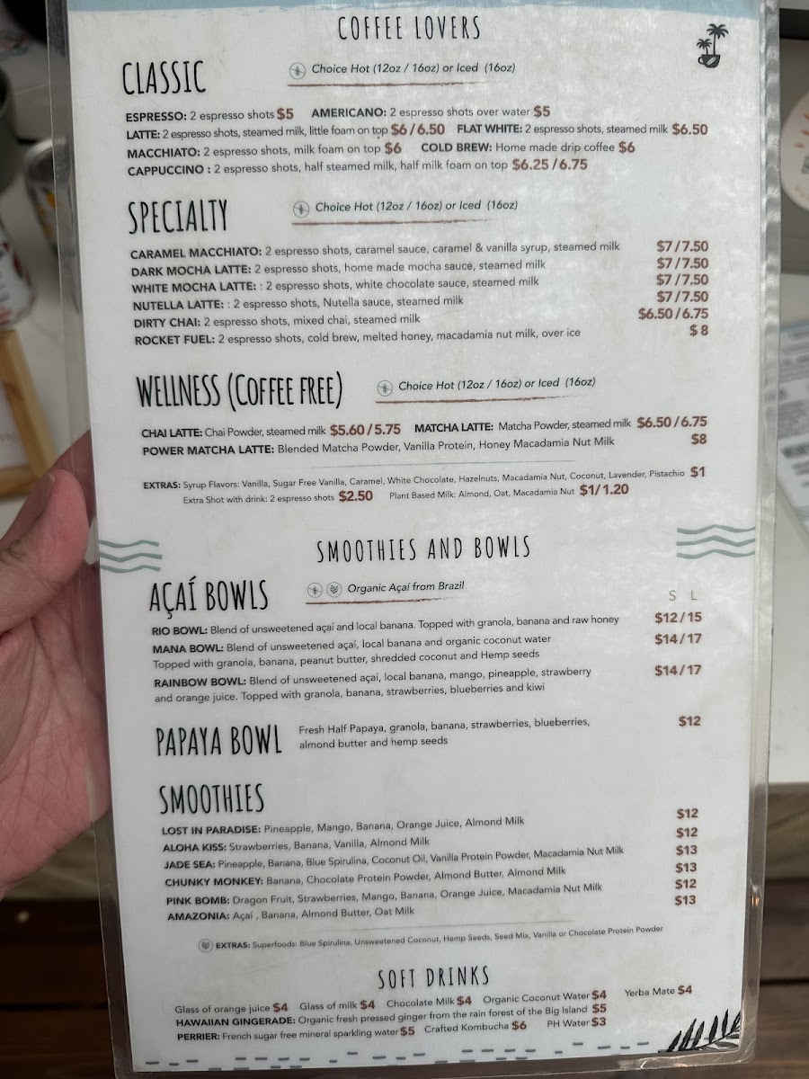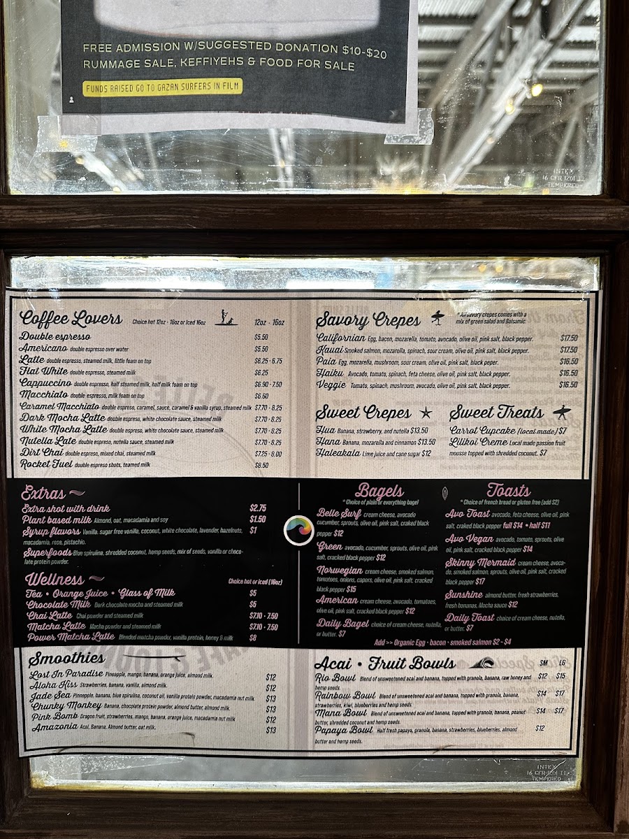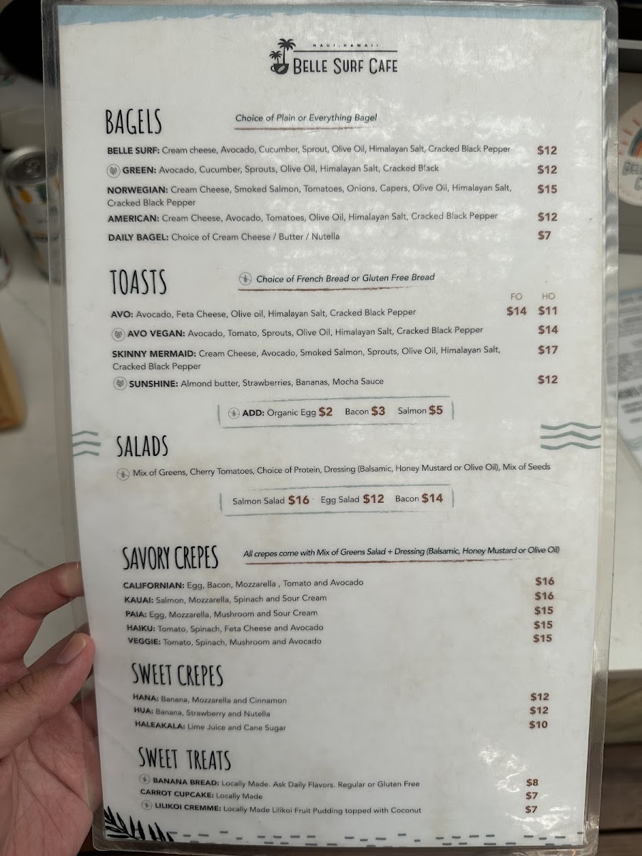As a reviewer looking back on the menu at Belle Surf Cafe & Lounge, it’s clear that this spot thoughtfully blends casual island dining with wellness-driven choices, creating a menu that feels both relaxed and intentional. From the grill, classics like the Belle Surf Burger, Veggie Burger, Steak Sandwich, and Steak Plate deliver hearty satisfaction, while lighter options such as the Green Salad and Mediterranean Salad balance things out nicely. The café’s beverage selection is just as diverse, ranging from refreshing soft drinks like Ph Water, Topo Chico, Soda, Yerba Matte Guayaky, and Hawaiian Gingerade, to a coffee program that caters to true enthusiasts with options such as Double Espresso, Americano, Latte, Flat White, Cappuccino, Espresso, Macchiato, and Cold Brew, alongside specialty favorites like Caramel Macchiato, Dark Mocha Latte, White Mocha Latte, Nutella Latte, and Dirty Chai. Wellness-focused drinks including the Chai Latte, Matcha Latte, and Power Matcha Latte complement vibrant smoothies like Lost In Paradise, Aloha Kiss, Jade Sea, Chunky Monkey, and Pink Bomb. Food offerings continue to impress with Acai Fruit Bowls such as the Rainbow Bowl and Papaya Bowl, savory crepes like Californian, Kauai, and Paia Veggie, and sweet crepes including Hana, Hua, and Haleakala. Add in comforting bagels (Green, Norwegian, American, Daily Bagel), flavorful toasts like Skinny Mermaid, Sunshine, and Daily Toast, and indulgent desserts such as the Carrot Cupcake and Lilikoi Creme, and the menu feels complete. Even families are well considered with Kids Specials like the Keiki Burger, Pasta With Butter And Cheese, Steak Plate, and Grom's Crepe, plus customizable extras including Extra Shot With Drink, Plant Based Milk, and Superfoods. Altogether, the menu at Belle Surf Cafe & Lounge successfully ties together comfort food, island freshness, and mindful choices, making it a fitting reflection of its laid-back yet health-conscious Paia vibe.